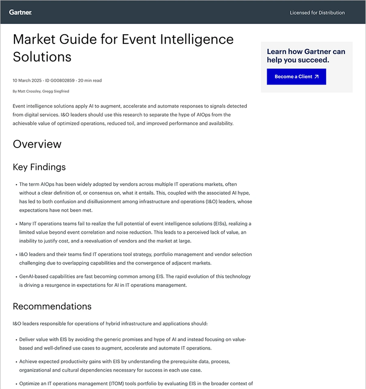 The 2025 Gartner® Market Guide for Event Intelligence Solutions reflects a shift in how IT operations leaders evaluate AI-driven technologies. As AI hype gives way to more practical evaluation, we