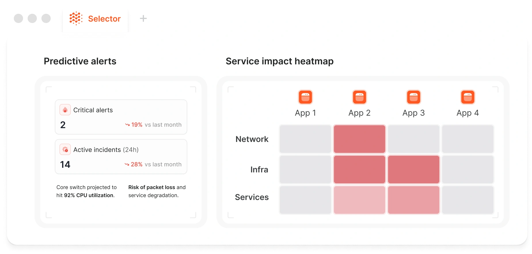 Selector’s AI-powered correlation and RCA engine filters alert noise to uncover the true cause behind incidents — enabling telecom teams to predict, prioritize, and resolve issues faster.